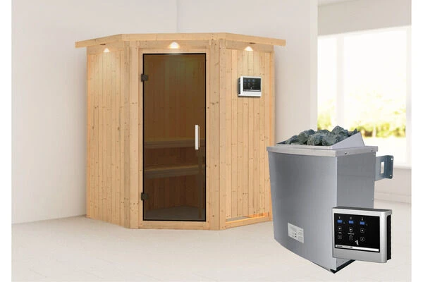 Sauna Larin aus Fichtenholz mit Eckeinstieg inkl. graphitfarbener Tür in verschiedenen Ausführungen von KARIBU