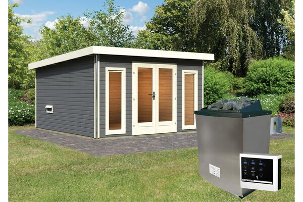 1 x KARIBU Mainburg 3 Saunahaus, terragrau, Fichte, 369x369x229 cm, SET B mit Doppelflügeltür, Vorraum und 9 kW Ofen