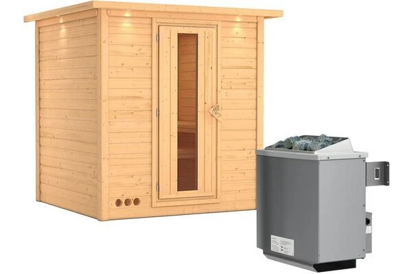 KARIBU Sauna Mojave mit Fronteinstieg und diversen Tür-, Ofen-, Steuerung- und Kranzoptionen