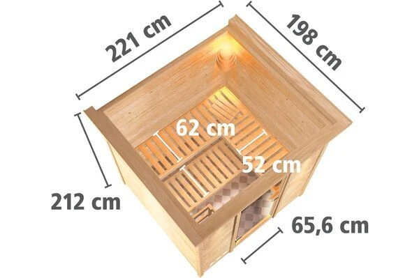 Die Massivholzsauna besticht durch Außenmaße von ca. 193 x 184 x 209 cm (mit Kranz ca. 221 x 198 x 212 cm), wodurch ein Innenmaß von ca. 182 x 173 x 200 cm resultiert. Nehmen Sie Platz in dieser Kabine und auf den drei Liegen, die ausreichend Platz spenden. Apropos Platz: diese Kabine verfügt über einen Rauminhalt von ca. 6,2 m³ bei einer Grundfläche von ca. 3,6 m². Ein weiterer Vorteil dieser Sauna ist, dass Sie diese frei im Raum positionieren können. Durch den Einsatz von vierseitig umlaufendem, besten Fichtenholz gibt es insgesamt vier Sichtseiten. Dadurch existiert quasi keine Rückwand. Abgerundet wird das Interieur durch drei Bänke und eine Kopfstütze