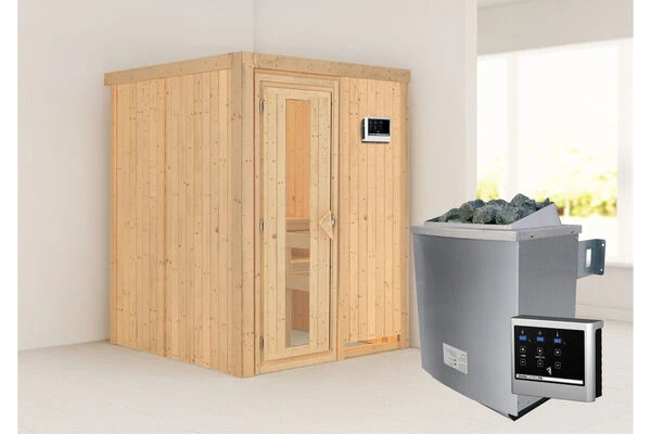 1x KARIBU Norin Sauna, naturbelassen, Fichte, ca. 151 x 151 x 198 cm, Fronteinstieg, Energiespartür mit Ofen 4,5 kW ext. Strg. Easy