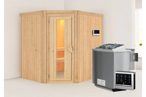 Sauna Siirin aus Fichtenholz mit Eckeinstieg und Energiespartür in verschiedenen Ausführungen von KARIBU