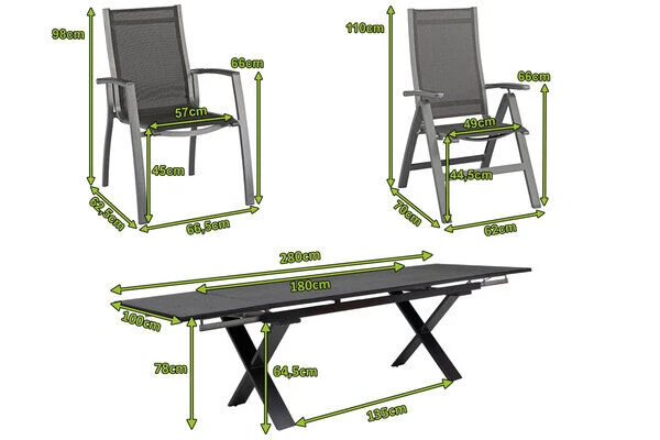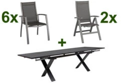 Verwandeln Sie Ihre Terrasse in einen charmanten Outdoor-Wohnbereich und genießen Sie jeden Tag Urlaubsflair in heimischen Gefilden. Die Esstischgarnitur besteht aus einem innovativen Ausziehtisch, 6 Stapelsesseln und 2 Multipositionssesseln – erleben Sie Flexibilität und Komfort vereint in einem stylischen Paket.