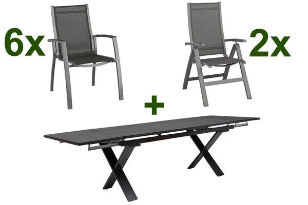KETTLER Altura Esstischgarnitur aus Aluminium/Textilene, Anthrazit, OUTFLEXX Ausziehtisch 180/280x100x78cm und 8 Stapel-/Multipositionssessel