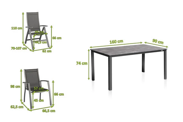 Der rechteckige Tisch für 4-6 Personen bietet Platz für eine ganze Familie. Die anthrazitfarbene Tischplatte besteht aus hochwertig verarbeitetem Kettalit und wird von einem soliden Gestell aus Aluminium in anthrazit getragen. Die positiven Eigenschaften von Aluminium sind zahlreich: Es ist leicht, wetterfest, stabil und elegant. In Kombination mit der Stabilität und der kratzfesten Oberfläche der Kettalit Tischplatte wird aus diesem Möbelstück das Highlight für Ihren Garten. Mit dem Stapelsessel aus der Serie Altura mit den Maßen von ca. 62,5 x 66,5 x 98 cm bequem durch den Sommer. Das solide und formschöne Gestell besteht aus edlem, anthrazitfarbenem Aluminium. Die ebenfalls anthrazitfarbene Sitzfläche wird aus wasserdurchlässigem, hochwertigem Outdoorgewebe gefertigt. Die Sitzfläche nimmt kein Wasser auf und trocknet schnell, so können Sie auch nach einem kleinen Regenschauer rasch wieder Platz nehmen. Das luftige Gewebe ist formstabil und trotzdem sehr bequem und zusätzlich UV- und sonnenölbeständig – insgesamt also der perfekte Begleiter in Ihrem Garten. Die Sessel lassen sich aufstapeln – wenn sie nicht benötigt werden können Sie sie platzsparend verstauen. Der Multipositionssessel mit den Maßen ca. 70-107 x 62 x 110 cm lässt sich mittels Rasterschiene leicht in 4 verschiedene Positionen bringen – so wird der Komfort eines Liegestuhls direkt integriert. Das solide und formschöne Gestell besteht aus edlem, anthrazitfarbenem Aluminium. Die ebenfalls anthrazitfarbene Sitzfläche wird aus wasserdurchlässigem, hochwertigem Outdoorgewebe gefertigt. Die Sitzfläche nimmt kein Wasser auf und trocknet schnell, so können Sie auch nach einem kleinen Regenschauer rasch wieder Platz nehmen. Das luftige Gewebe ist formstabil und trotzdem sehr bequem und zusätzlich UV- und sonnenölbeständig – insgesamt also der perfekte Begleiter in Ihrem Garten. Dank der leichten Materialien und des Klappmechanismus lässt sich der Stuhl leicht handhaben – wenn er nicht benötigt wird können Sie ihn platzsparend verstauen.