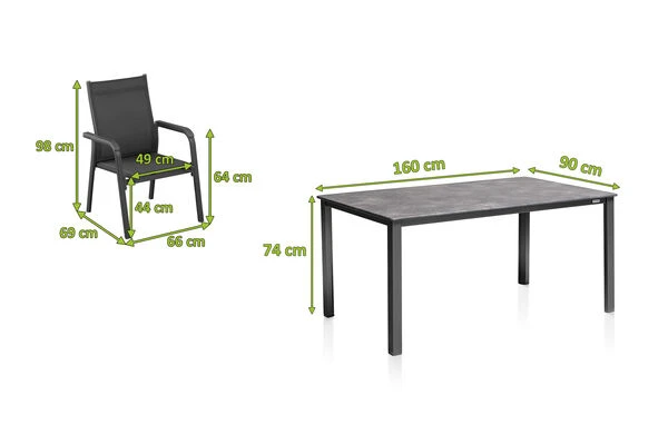 Bei dieser Esstischgruppe treffen hochwertige Materialien und Design auf modernste Weise aufeinander. Das Set besteht aus einem innovativen Esstisch der Marke KETTLER mit den Maßen von ca. 160 x 90 x 74 cm und 4 Stapelsessel der Marke KETTLER.