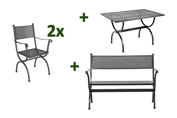 MBM Romeo Esstischgarnitur, marone, Schmiedeeisen, verzinkt, pulverbeschichtet, Tisch 125×75 cm, Bank, 2x Sessel