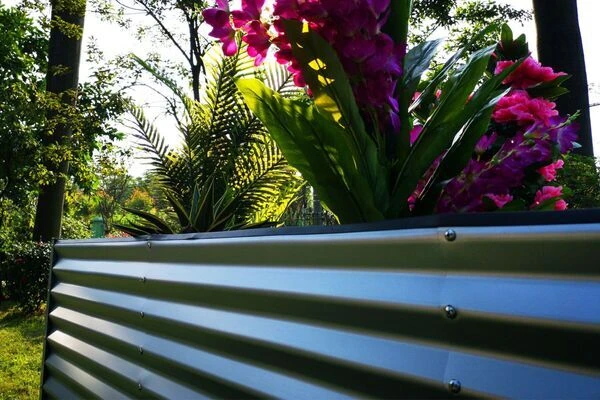 Das silberfarbene Hochbeet aus dem Material Zincalume hat die Maße von ca. 270 x 270 x 90 x 84 cm und ist dank seiner besonderen Eck-Form auch zum optischen Eingrenzen, beispielsweise von der Terrasse, bestens geeignet. Die Gummi-Ummantelung am oberen Rand des Hochbeets sorgt für ein sicheres Arbeiten am Hochbeet und die 6 nicht sichtbaren Querstreben im Hochbeet sorgen für zusätzliche Stabilität. Beim Werkstoff „Zincalume“ handelt es sich um ein mit Zink und Aluminium beschichtetes Stahlblech, das durch die Beschichtung jahrelang resistent gegen Umwelt- und Witterungseinflüsse ist. Seine Lebensdauer ist vier mal länger als bei galvanisiertem Stahl.