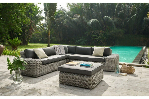 Wie wäre es z.B. mit dieser modernen Polyrattan Lounge von OUTFLEXX®. Das rostfreie Aluminiumgestell verschwindet unter den geschickt geflochtenen Polyrattan-Fasern und sorgt sozusagen unsichtbar für Stabilität. Die großen Sitzflächen bieten ausreichend Platz für perfekte Entspannung. Wer möchte, lädt einfach mal wieder zu einem gemütlichen Grillabend mit Freunden ein. Beeindrucken Sie Ihre Gäste mit dieser schönen Ecklounge und holen Sie sich Ihr Wohnzimmer in den Garten. Der zusätzliche Hocker lässt sich kinderleicht und schnell zum Tisch umfunktionieren und eignet sich dann ideal als Ablage für das kostbare Grillgut. So oder so ähnlich könnten die nächsten Sommerabende ab sofort bei Ihnen zu Hause in Ihrem Garten aussehen.