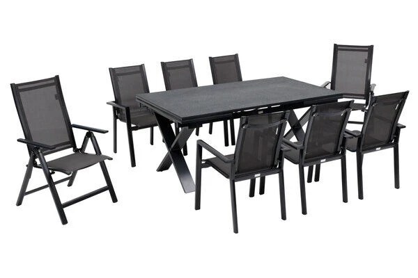 OUTFLEXX® Esstischgarnitur aus Aluminium/Textilene in anthrazit, Ausziehtisch 180/280x100x78cm und 8 Stapel-/Multipositionssessel