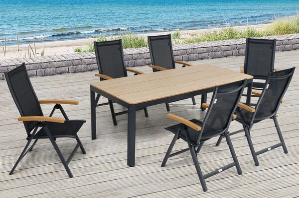 Das Set besteht aus einem Esstisch und 6 dazu perfekt harmonierenden Multipositionssesseln. Sein moderne Flair fügt sich sowohl im Garten, auf dem Balkon oder auch im Haus perfekt ein. Freuen Sie sich darauf nach einem leckeren, gemeinsamen Essen in die komfortable Liegeposition zu wechseln und bei einem Nickerchen den Alltag in weite Ferne rücken zu lassen. Die Multipositionssessel sind luftig leicht und doch stabil. Für das schicke und solide Gestell kommt korrosionsbeständiges Aluminium zum Einsatz. Bespannt wird das solide Gestell mit Textilene im passenden Schwarzton. Es ist unglaublich hautsympathisch und sorgt für ein herrlich luftiges Sitzgefühl, das Sie auch in der Sommerhitze nicht im Stich lässt. Die Gesamtmaße des Sessels liegen bei ca. 67 x 58 x 107 cm. Mit einer einer Sitztiefe von ca. 43 cm sitzen Sie stets komfortabel. Das Holzimitat schafft Ihnen so die Optik von Holz, hat aber den geringen Pflegeaufwand von Kunststoff und ist zudem wetterfest. Dank der hohen Qualität und erstklassigen Verarbeitung ist der ca. 5,05 kg leichte Sessel bis zu ca. 120 kg belastbar. Die Rückenlehne lässt sich ganz leicht 7-fach bis in die waagerechte Position verstellen und ermöglicht Ihnen somit vollste Entschleunigung. So können Sie spielend von einer Liege- in eine Sitzposition und wieder zurück wechseln, ganz nach Bedarf und Komfortwunsch. Das offene Design der Rückenflächen werden Sie besonders bei warmen Temperaturen zu schätzen wissen. Genießen Sie das hervorragende Sitz- und Liegegefühl Ihrer neuen Sitzmöbel! Zur Aufbewahrung können die Sessel einfach platzsparend in Ihrer Garage oder Ihrem Gartenhäuschen zusammengeklappt werden.