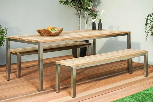 OUTFLEXX® Esstischgarnitur, Edelstahl/recyceltes FSC®-Teakholz, Tisch ca. 180 x 90 x 76 cm, 2 Bänke