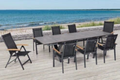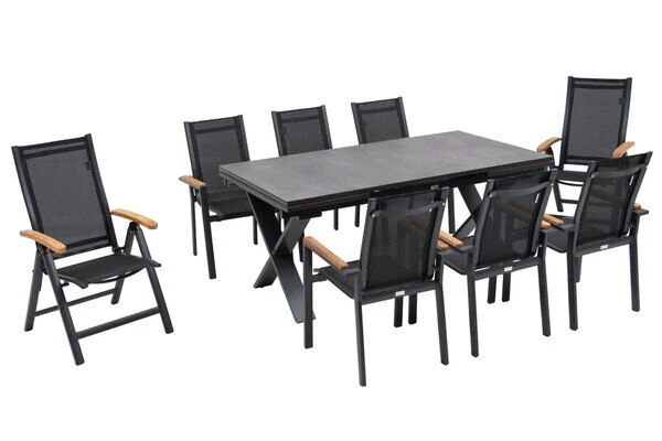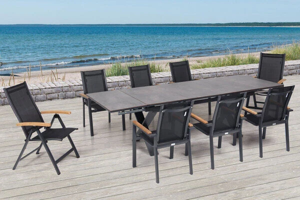 OUTFLEXX® Esstischgarnitur aus Aluminium/HPL/Textilene in schwarz, Ausziehtisch 180/280x100x78cm, inkl. 8 Stapel-/Multipositionssessel mit recyceltem FSC®-Teakholz
