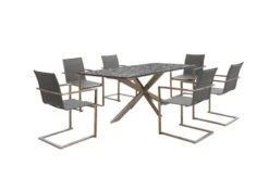 1x OUTFLEXX Esstischgarnitur, silber/anthrazit, Edelstahl/Granit/Textilene, 200×100 cm, 6 Freischwinger, padded, Armlehnen aus FSC-Teak