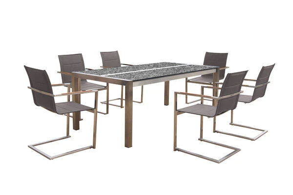 OUTFLEXX Esstischgarnitur, silber/anthrazit, Edelstahl/Granit/Textilene, 200×100 cm, 6 Freischwinger, padded, Teakarmlehnen