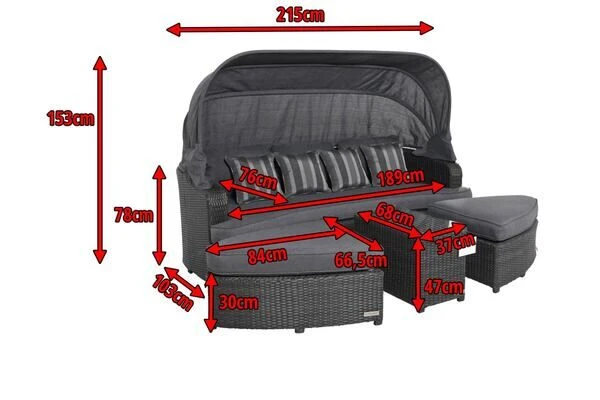 Sie erhalten das Loungebett Houston (ca. 215 x 103 x 78 cm) zusammen mit zwei Hockern (jeweils ca. 82 x 66,5 x 30 cm) und einem praktischen Kaffeetisch (ca. 68 x 37 x 47 cm) mit einer Tischplatte aus ca. 5 mm Sicherheitsglas. Das Loungebett ist ein wahrer Wandlungskünstler und vielfältig einsetzbar. Lassen Sie sich von diesem gemütlichen Möbelstück in seinen Bann ziehen, es bietet Ihnen und Ihrem Partner genügend Platz zum Sonnenbaden und Beine hochlegen. Wenn Sie die Hocker und den Tisch auseinanderschieben erhalten Sie zusätzliche Sitzmöglichkeiten, so dass bis zu 4 Personen bequem Platz finden. Die Sitzhöhe beträgt ca. 31 cm. Egal ob Sie ein Sonnenbad nehmen, im Schutz des Sonnendaches ein gutes Buch genießen oder mit Ihren Lieben zusammen den Tag ausklingen lassen möchten: es ist alles mit wenigen Handgriffen möglich.