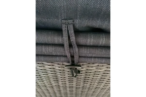 Die gemütlichen anthrazitfarbenen Kissen (100 % Olefin (243 g/m³)) mit einer Stärke von ca. 10 cm (Rückenkissen ca. 20 cm) sorgen für höchsten Sitz- und Liegekomfort. Sie erhalten 4 weitere Kissen im grau/anthrazit-gestreiften Design damit Sie es sich so richtig gemütlich machen können. Praktisch sind auch die Laschen an den Hockerkissen, die Sie somit leicht am Loungegestell befestigen können ? so verrutscht nichts, wenn Sie sich in die Sonne legen und entspannen. Das Untergestell aus stabilem Aluminium ist mit witterungsbeständigem Polyrattan-Geflecht in der Farbe grau (HX88424) bespannt. Das halbrunde Geflecht ist farblich auf die Polster und den Bezug des ebenfalls anthrazitfarbenen Sonnendaches abgestimmt und passt wunderbar zu Ihrer weiteren Gartenausstattung.