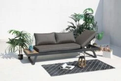 Verstellbare Lounge/Liege von OUTFLEXX aus Aluminium und Textilene, mit Polyesterpolstern in modernem Dunkelgrauton, 228×78 cm, mit praktischer Ablage aus Holzimitat