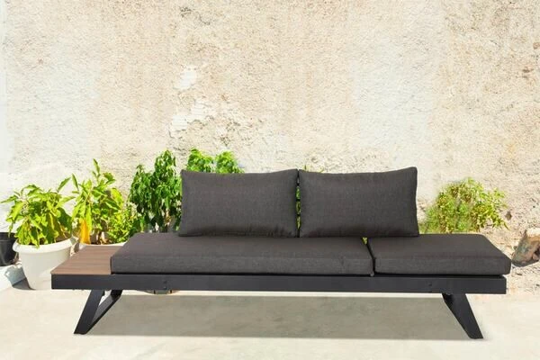 Das moderne Design, die ansprechenden Farben und die Multifunktionalität lassen diese Lounge/Liege zum Lieblingsort auf Ihrer Terrasse oder im Garten werden. Die Lounge bietet Platz für 3 Personen und hat eine praktische Ablagefläche für Ihre Getränke oder Snacks. Falls Sie sich mit einem interessanten Buch entspannen möchten, kann ein Seitenteil in vier Positionen verstellt werden und bietet somit viele verschiedene Sitz- und Liegemöglichkeiten. Die besonders dicken Polster laden zum bequemen Verweilen und Genießen ein. Der Bezug aus pflegeleichtem Polyester kann mittels Reißverschluss abgenommen und bei 30°C gewaschen werden. Unter den Polstern befindet sich eine Fläche aus luftigem Textilenegewebe – ideal für einen sommerlichen Sonnenbad. Durch das geringe Gewicht kann Ihre Lounge problemlos umgestellt werden. Die schwarzen Fußkappen verhindern, dass der Boden dabei zerkratzt wird.