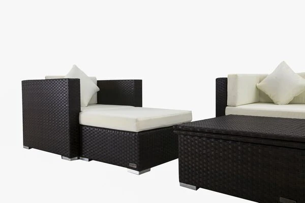 Mit ihrem klaren Design und den variablen Anordnungsmöglichkeiten wird diese Sitzgruppe das neue Highlight in Ihrem Garten. Das verwendete wetterfeste Geflecht aus strapazierfähigem, flachen Polyrattan ist besonders UV-beständig und trotzt auch extremen Temperaturen. Im Inneren befindet sich ein rostfreies Aluminiumgestell, welches für die nötige Stabilität sorgt und aufgrund des geringen Gewichts einen einfachen Platzwechsel ermöglicht.