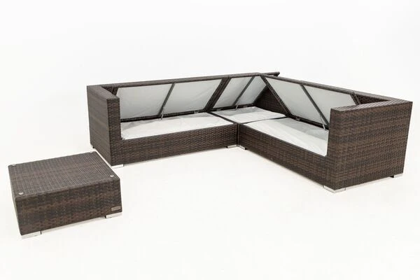 Dieses Loungemöbel-Set bietet Ihnen dank seiner ca. 10 cm dicken und bequemen Polsterung besten Komfort, um stundenlang relaxen zu können. Die Polster werden durch wasserabweisende Bezüge aus 100% Polyester (180g/m²) geschützt. Besonderes Extra – Die Sitzflächen der Module lassen sich wie im Artikelbild gezeigt hochklappen und der darunter liegende Stauraum bietet Platz für alle Polster. Dieser Stauraum ist mit einer wasserdichten Kissentasche ausgestattet, die mittels Reißverschluss geschlossen wird. So lassen sich die Polster sicher und platzsparend verstauen.