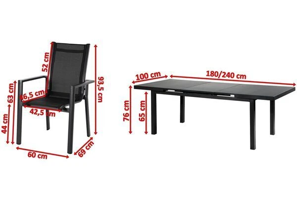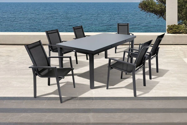 OUTFLEXX® Premium Esstischgarnitur, OUTFLEXX® anthrazit matt, Alu/Textilene, Premium Ausziehtisch 180/240x100cm, 6 Stapelsessel