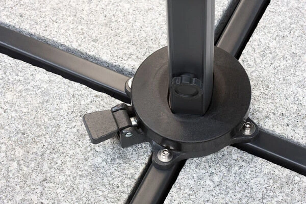 - um 360° drehbar dank Drehteller mit Fußpedal am Ende des Schirmmastes