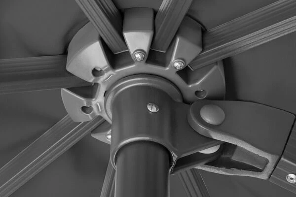 | Kurbelsystem Mit der im Griffteil eingearbeiteten Kurbelmechanik können Sie den Schirm ganz einfach öffnen und schließen. Des Weiteren können Sie hiermit die Dachneigung komfortabel einstellen. | |