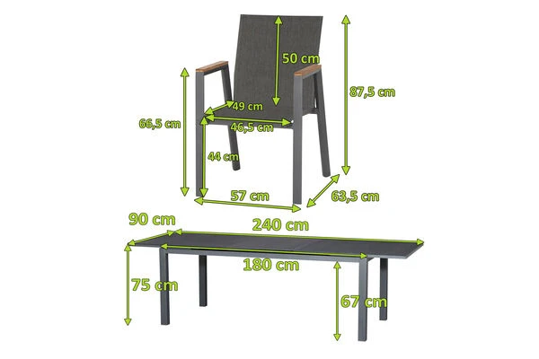 SIENA GARDEN Gomera II/Miros Esstischgarnitur, matt graphit/grau, Alu/Teak/Spraystone/Texfabric, Tisch 180/240×90 cm, 8 Stapelsessel