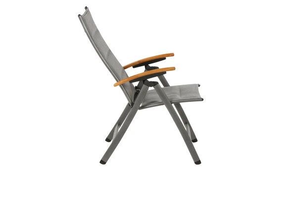 Der Klappsessel ist nicht nur ein Highlight in Sachen Optik, sondern weiß auch durch seinen Komfort und durch seine qualitative Verarbeitung zu überzeugen. Für ein komfortables Sitzen sorgt die hochwertige Texfabric Bespannung, die den Klappsessel auch ohne Auflagen äußerst bequem macht. Außerdem ist die Rückenlehne 10-fach verstellbar, sodass der Sessel je nach Bedarf in eine Sitz- oder Liegeposition gebracht werden kann. Das zeitlose Design aus einem Aluminiumgestell mit einer Textilenbespannung in der Farbe grau, macht den Sessel zu einem optischen Highlight für jede Terrasse. Armlehnen aus Teakholz ergänzen das edle Design. Dank der verwendeten Materialien hat dieser Multipositionssessel das sehr geringe Eigengewicht von ca. 5,9 kg, wodurch er leicht zu handhaben ist und bei Bedarf schnell und einfach zusammengeklappt und platzsparend verstaut werden kann.