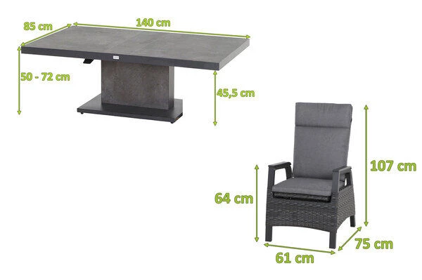 Der praktische Lifttisch Bellani ist ein wahres Multitalent, er ist ideal als Kaffee- und Esstisch einsetzbar. Er bietet mit Maßen von ca. 140 x 85 x 50/72 cm großzügig Platz für bis zu 4 Personen – so steht einem leckeren Brunch oder einem gemütlichen Kaffeekränzchen nichts im Wege. Durch einen Hebel unterhalb der Tischfläche können Sie den Tisch problemlos mittels eines Hydrauliksystems stufenlos höhenverstellen. Der Tischunterbau besteht aus Keramikplatten in dunkelgrau. Das Gestell wurde aus pulverbeschichtetem Aluminium in matt anthrazit hergestellt. Die Tischplatte in dunkelgrau ist aus Keramik und dadurch robust, pflegeleicht und dazu noch wetterfest – ideal für die Nutzung im Outdoor- und Innenbereich.